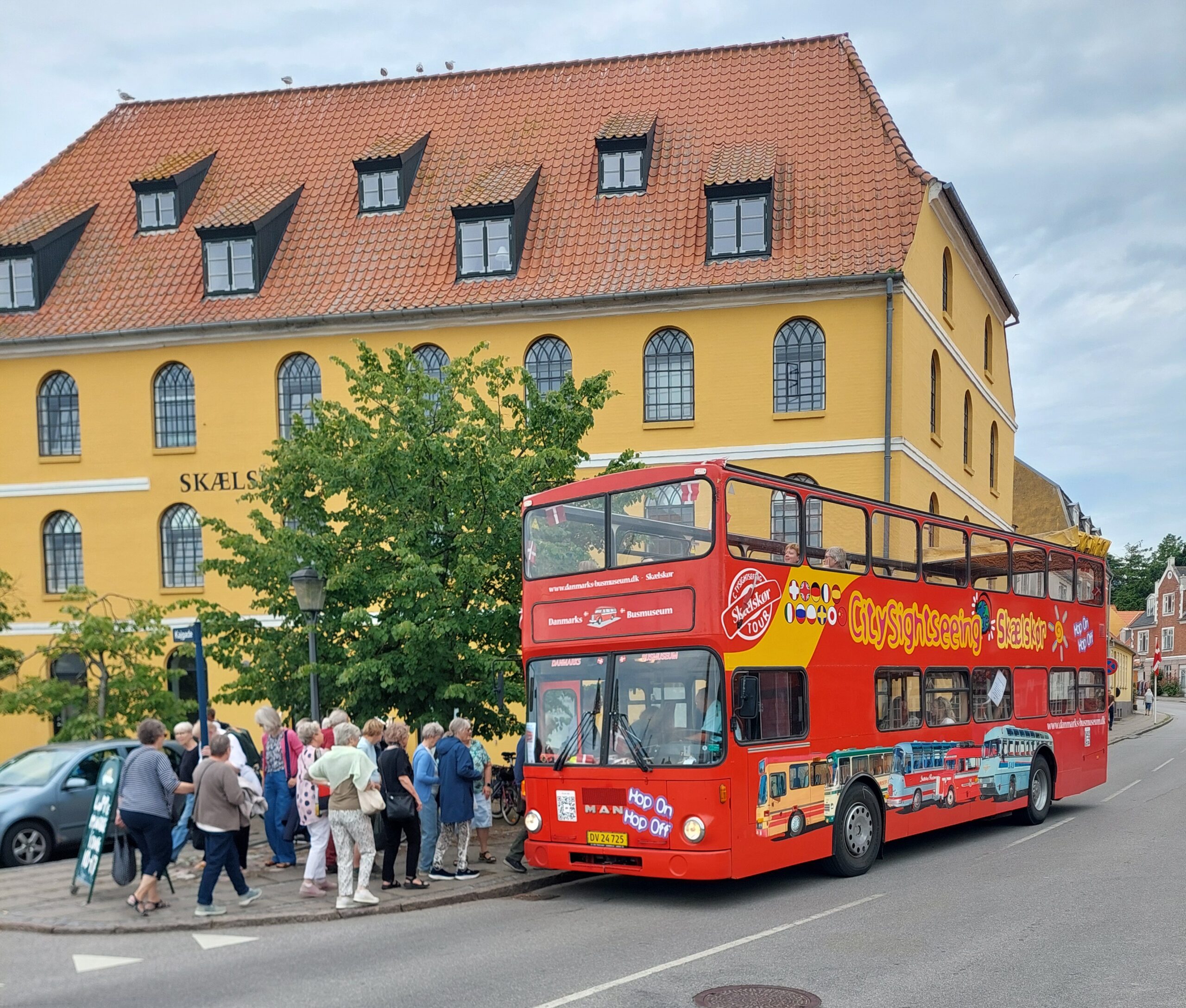 Fra og med uge 25 til og med uge 34 kører vi guidede rundture i Skælskør i en dobbeltdækker bus hver fredag, lørdag og søndage, 3 gange dagligt.